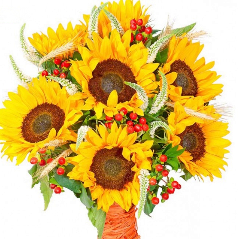 Букет состоит из 9 подсолнухов, 10 веток гиперикума, 12 вероника белая, колосья, зелень, прозрачная упаковка, атласная лента.