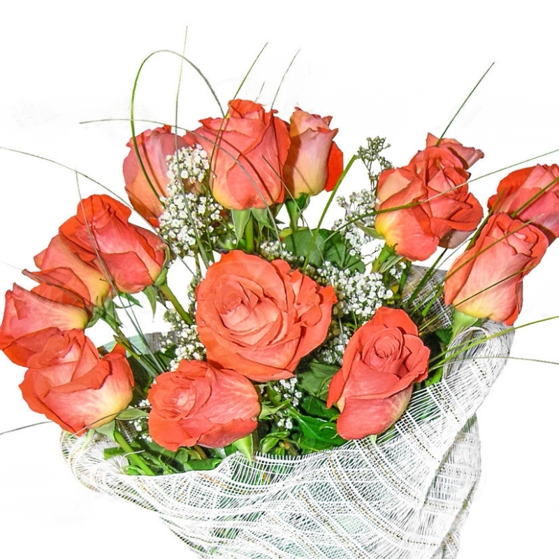 Букет состоит из 13 оранжевых роз, 2 ветки гипсофилы, зелень, красивая упаковка, зелень.