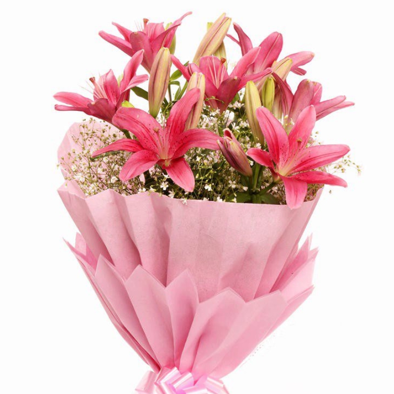 Букет состоит из 5 розовых лилий, 4 гипсофила, красивая упаковка, атласная лента.