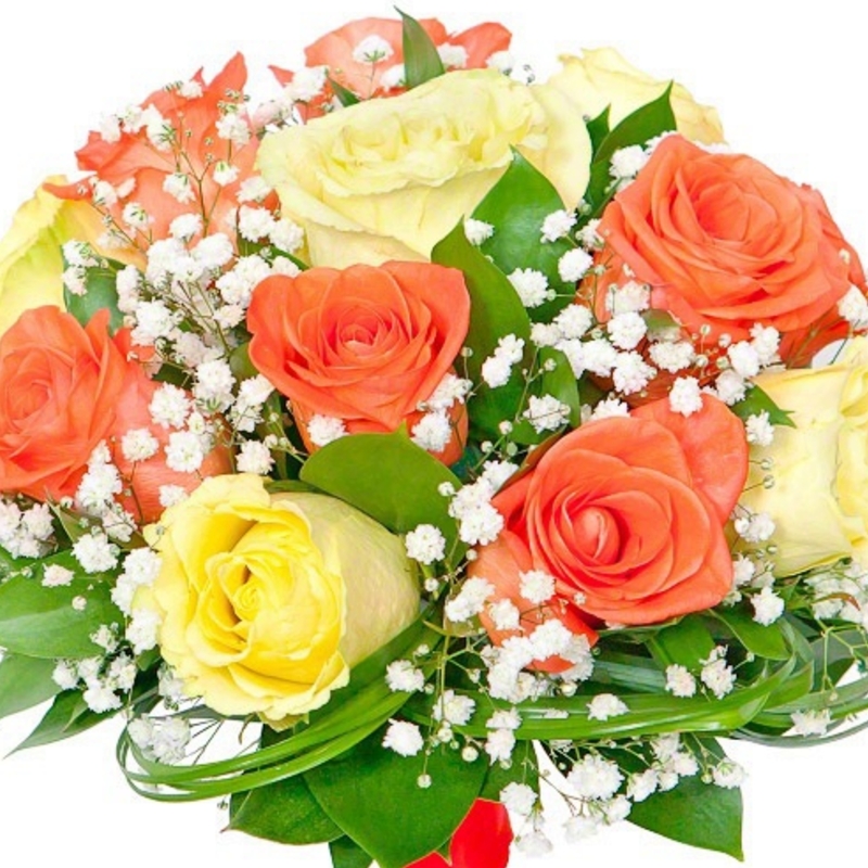 Букет состоит из 8 коралловых роз, 7 желтых роз, 4 гипсофила, зелень, лента.