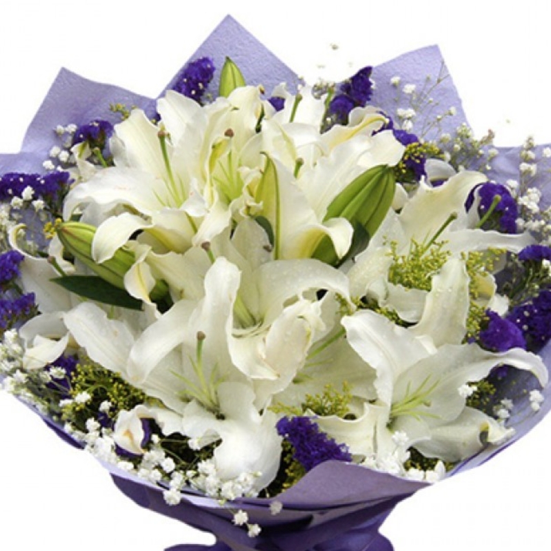 Букет состоит из 13 красных роз, 7 веток белых лилий, красивая упаковка, атласная лента.