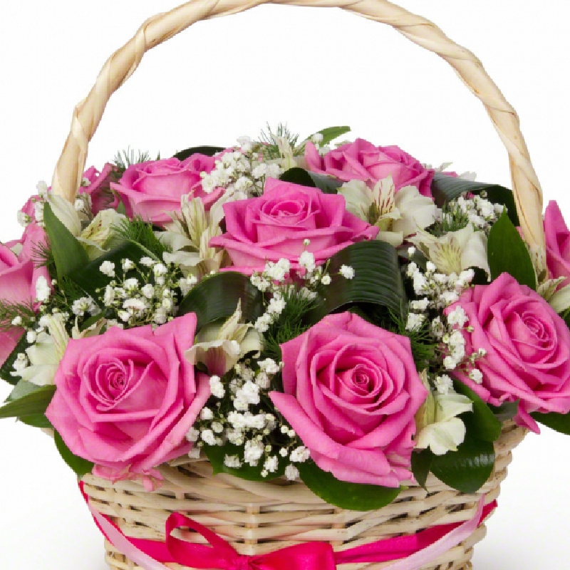 11 розовых роз, 2 ветки гипсофилы, зелень, корзина, оазис, атласная лента.