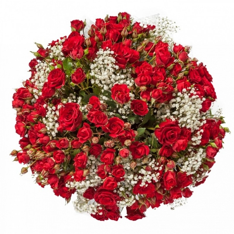 Букет состоит из 51 красная кустовая роза, 10 веток гипсофилы, сизаль, атласная лента.