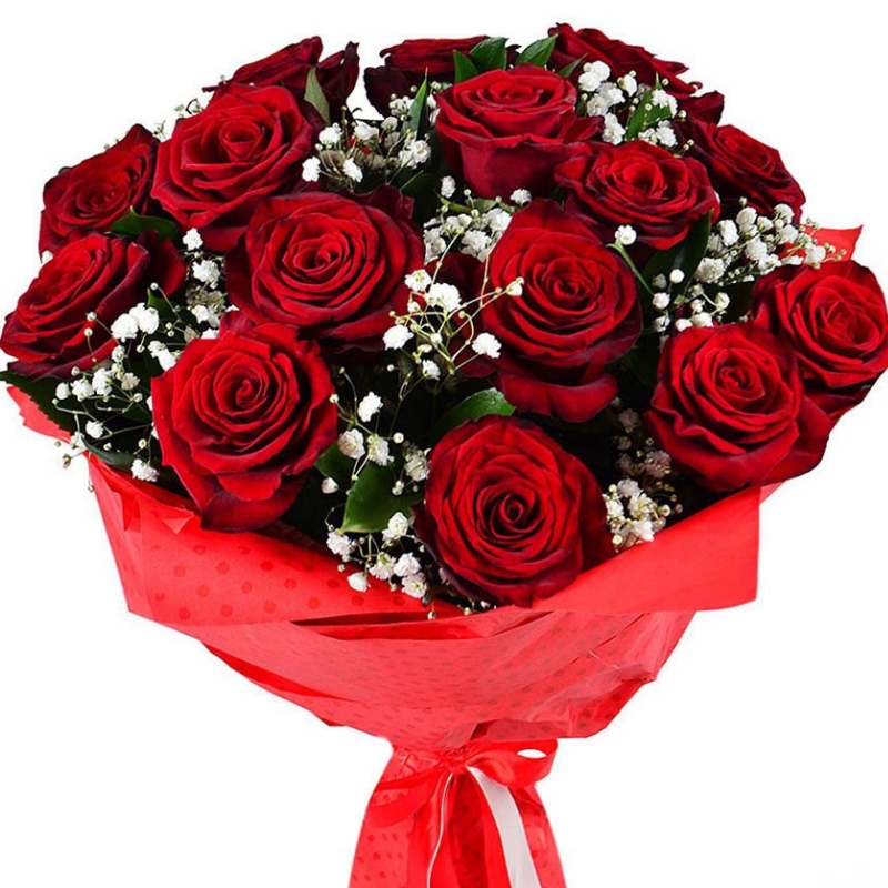 Букет состоит из 15 красных роз, 3 ветки гипсофилы, красивая упаковка, атласная лента.