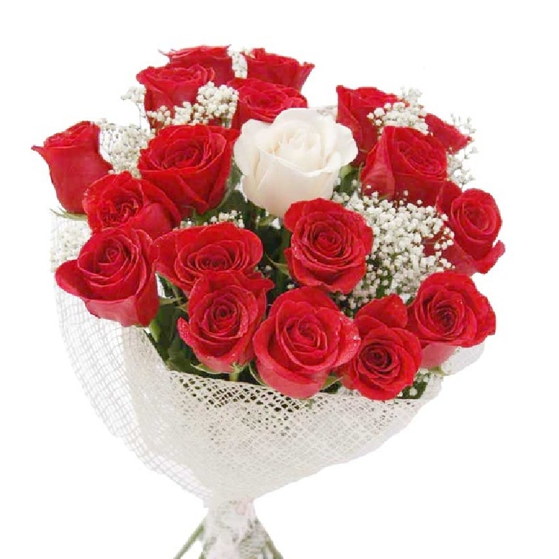 Букет состоит из 18 красных роз, 1 белая роза, 2 ветки гипсофилы, красивая упаковка, атласная лента.