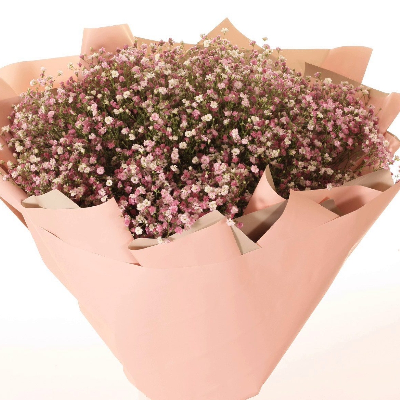 Букет состоит из 15 веток розовой гипсофилы, крафт, атласная лента.