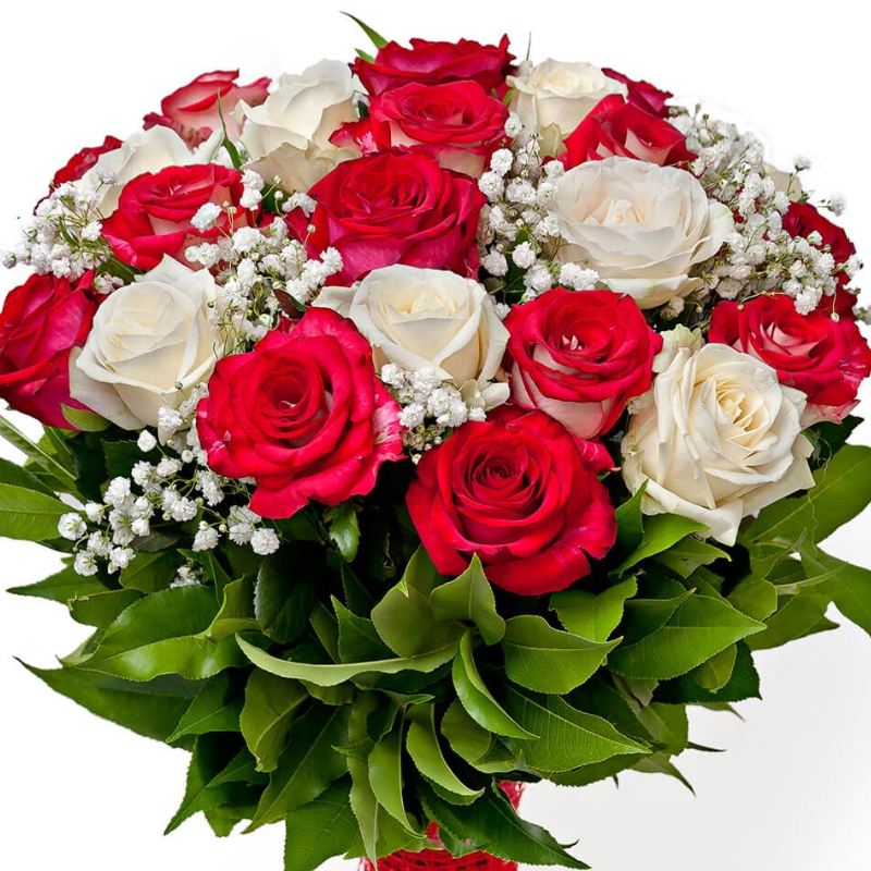 Букет из 25 красных и белых роз с гипсофилой