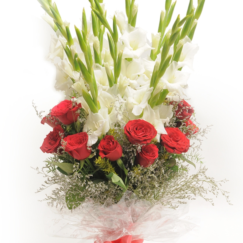 Букет состоит из 10 белых гладиолусов, 15 красных роз, 5 лимониум, красивая упаковка, атласная лента.