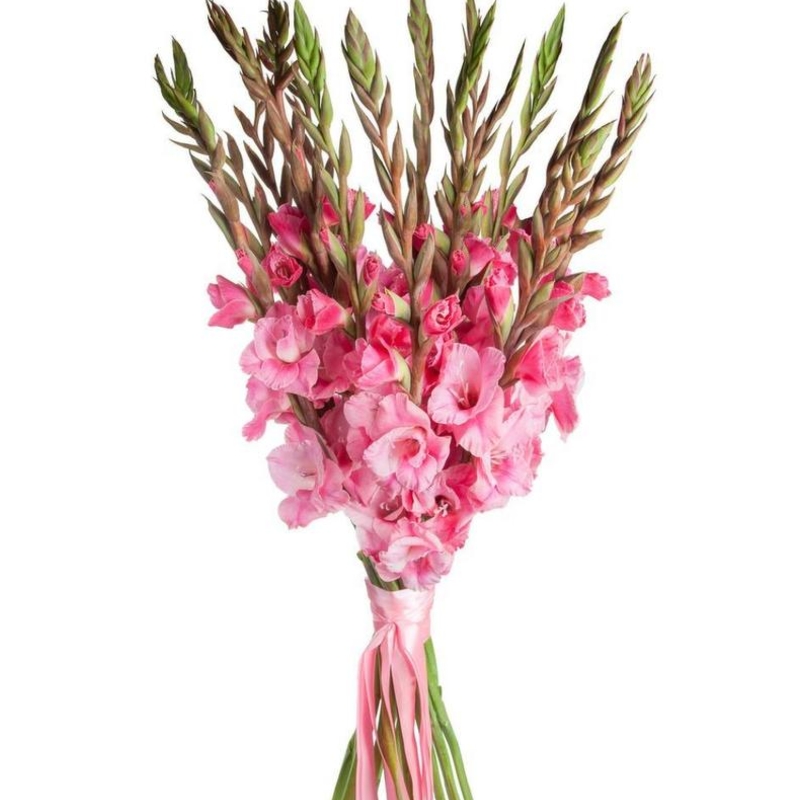 Букет состоит из 15 розовых гладиолусов, прозрачная упаковка, атласная лента.