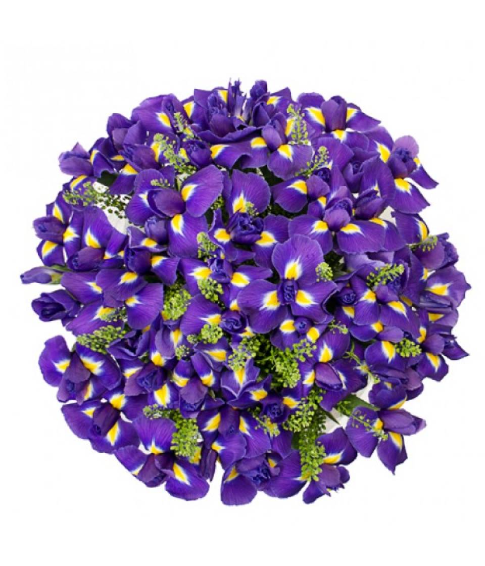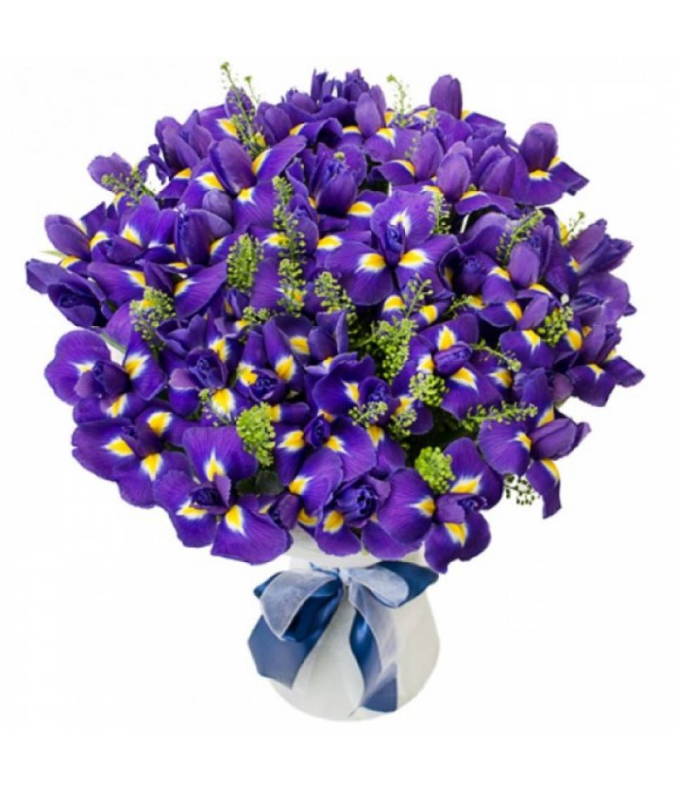 Букет состоит из 51 ирис, 3 грин белл, упаковка, лента.