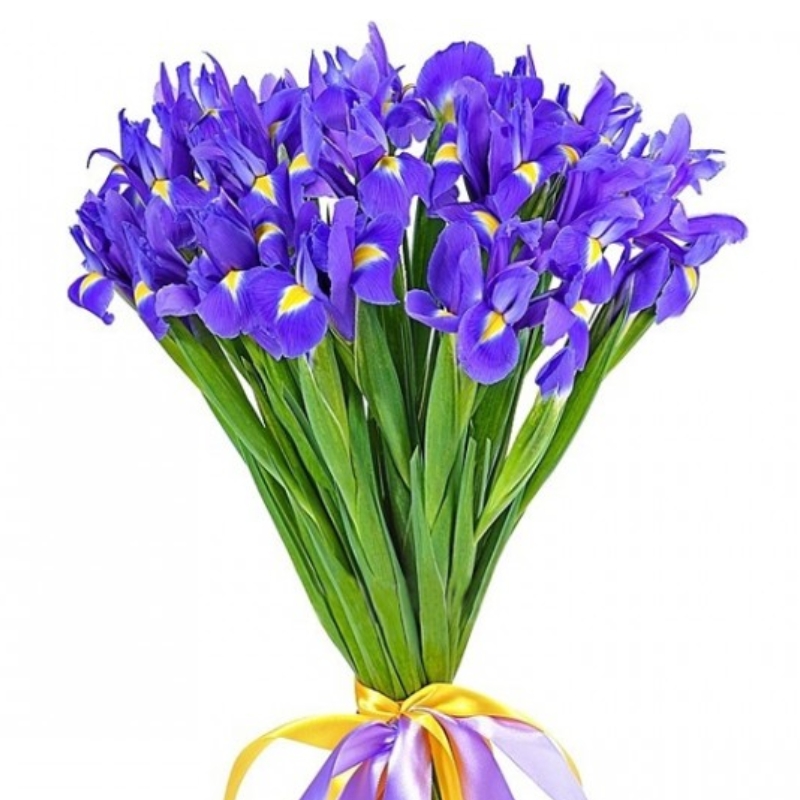 Букет состоит из 19 ирисов, прзрачная упаковка, атласная лента.