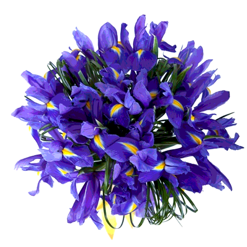 Букет состоит из 29 ирисов, прозрачная упаковка, атласная лента.