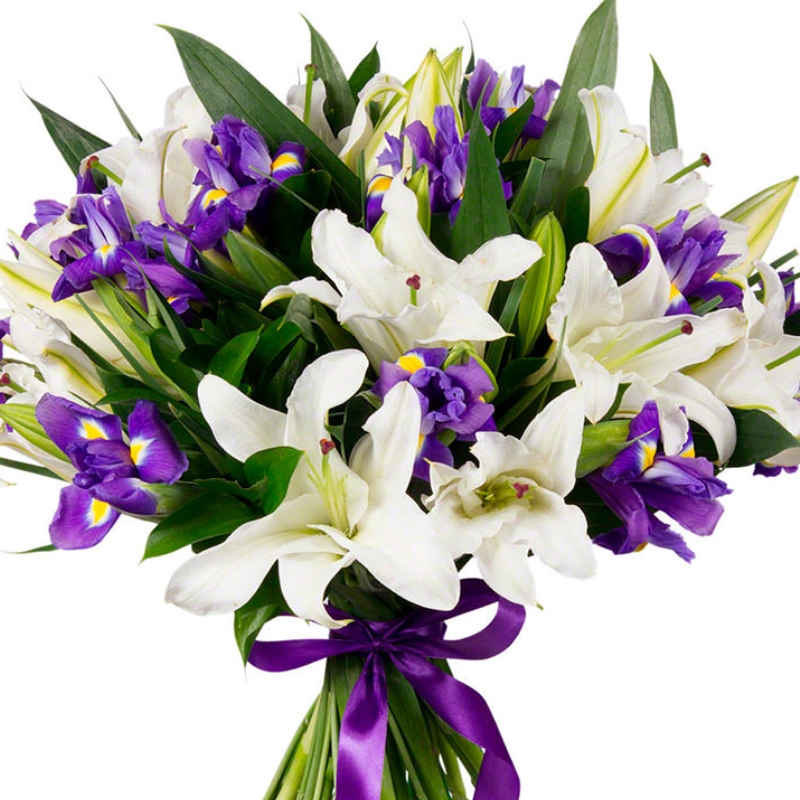 Букет состоит из 7 веток белых лилий, 20 ирисов, рускус, прозрачная упаковка, атласная лента.