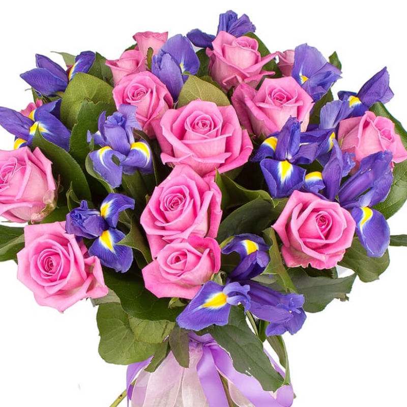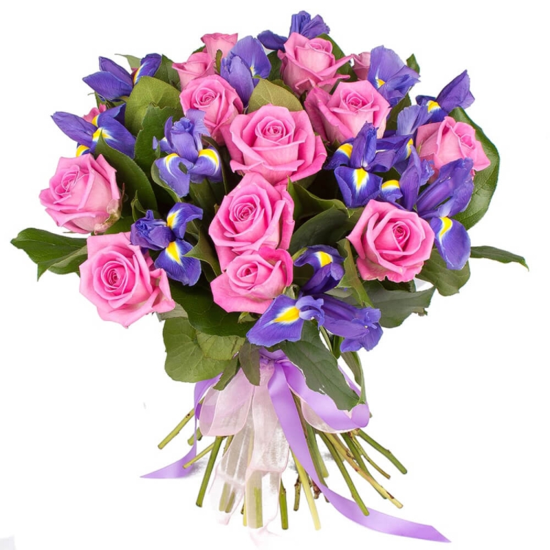 Букет состоит из 15 розовых роз, 10 ирисов, салал, прозрачная упаковка, атласная лента.