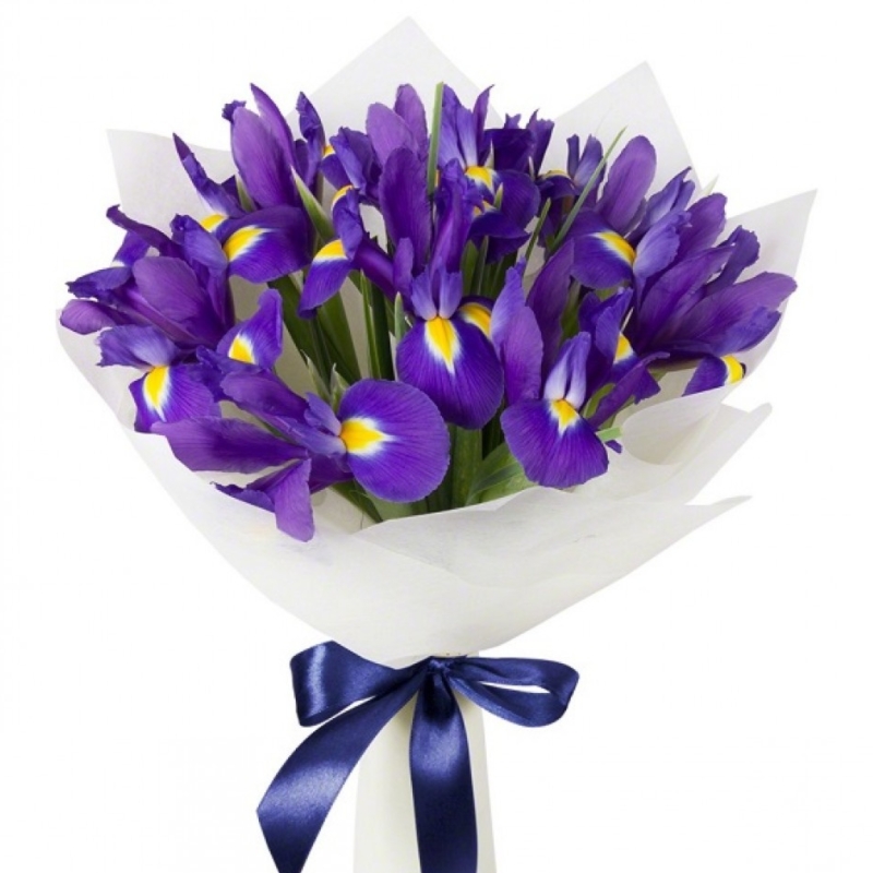 Букет состоит из 21 ирис, белая упаковка, синяя лента.