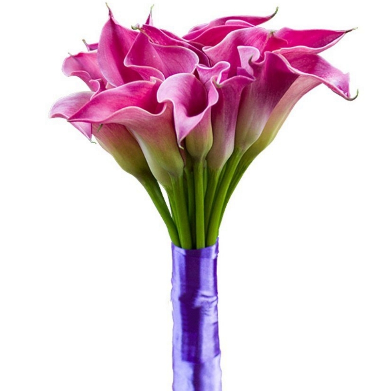 Букет состоит из 19 розовых калл, прозрачная упаковка, атласная лента.