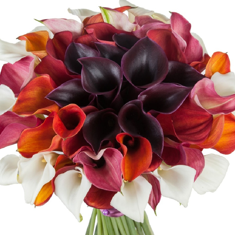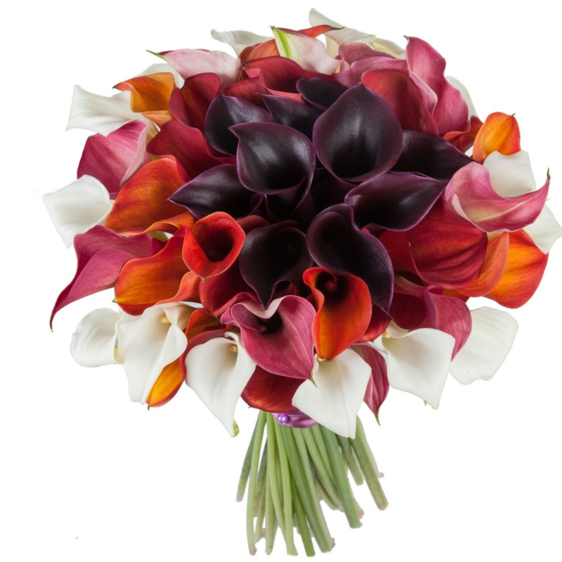 Букет состоит из MIX из 45 калл, прозрачная упаковка, атласная лента.