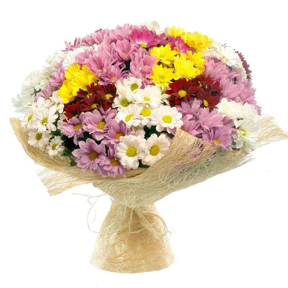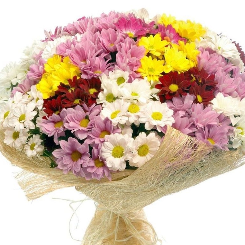 Букет состоит из MIX из 25 веток разноцветных хризантем, красивая упаковка, атласная лента.