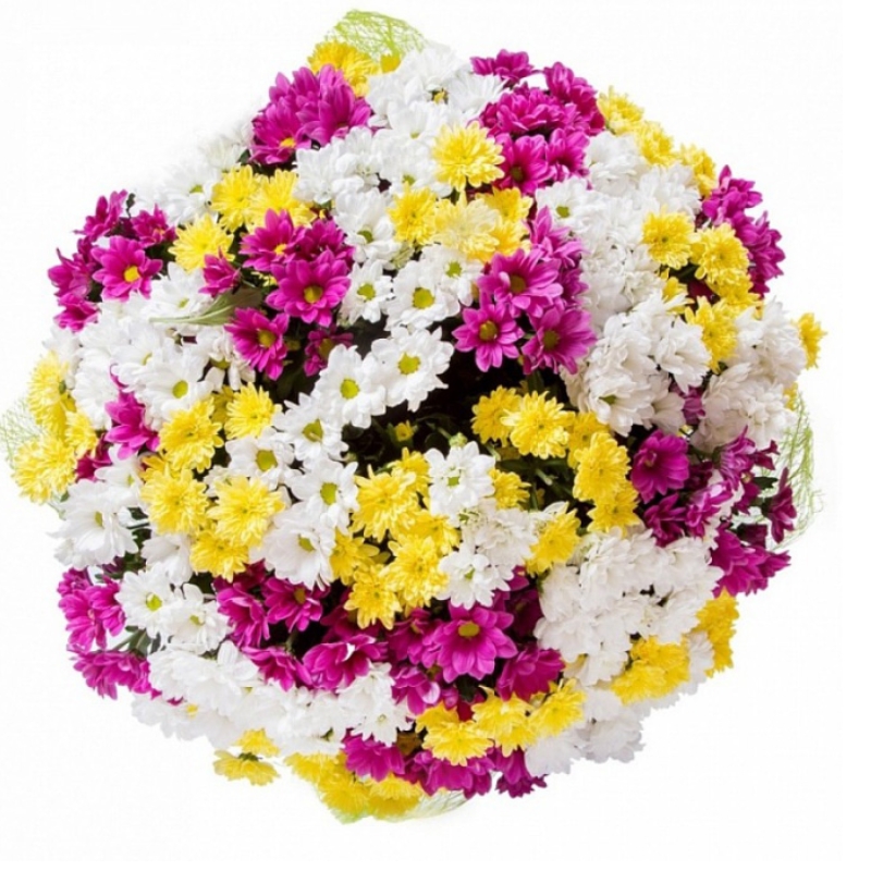Букет состоит из MIX из 51 хризантемы, прозрачная упаковка, атласная лента.