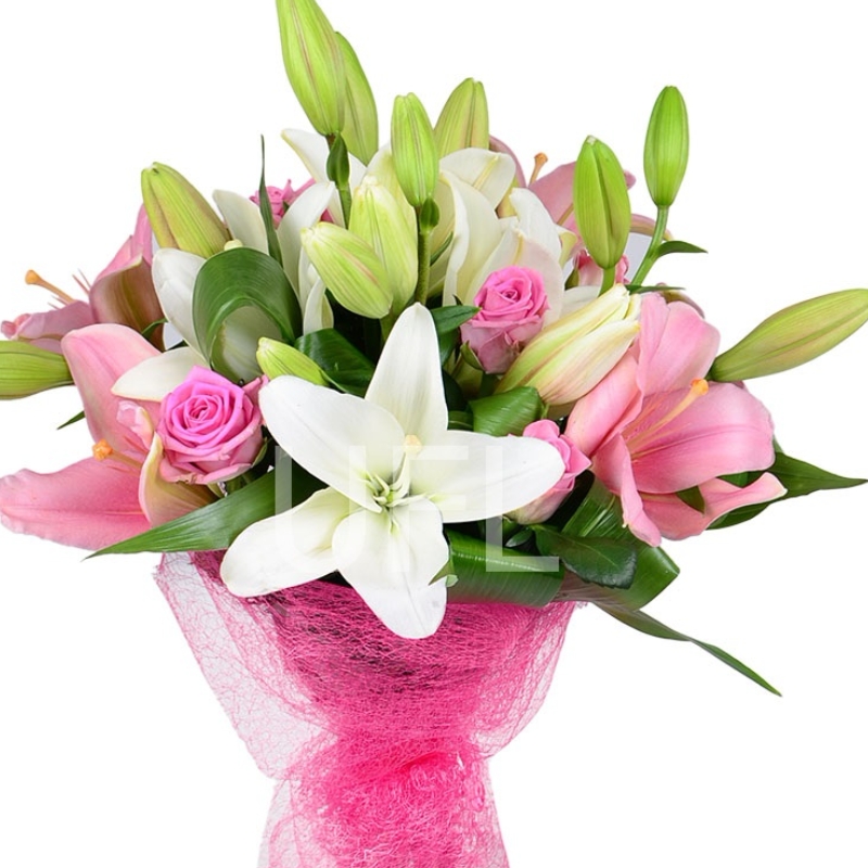 Букет состоит из 7 розовых роз, 3 белые лилии, 3 розовые лилии, аспидистра, красивая упаковка, атласная лента.