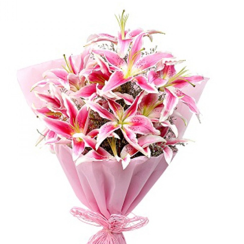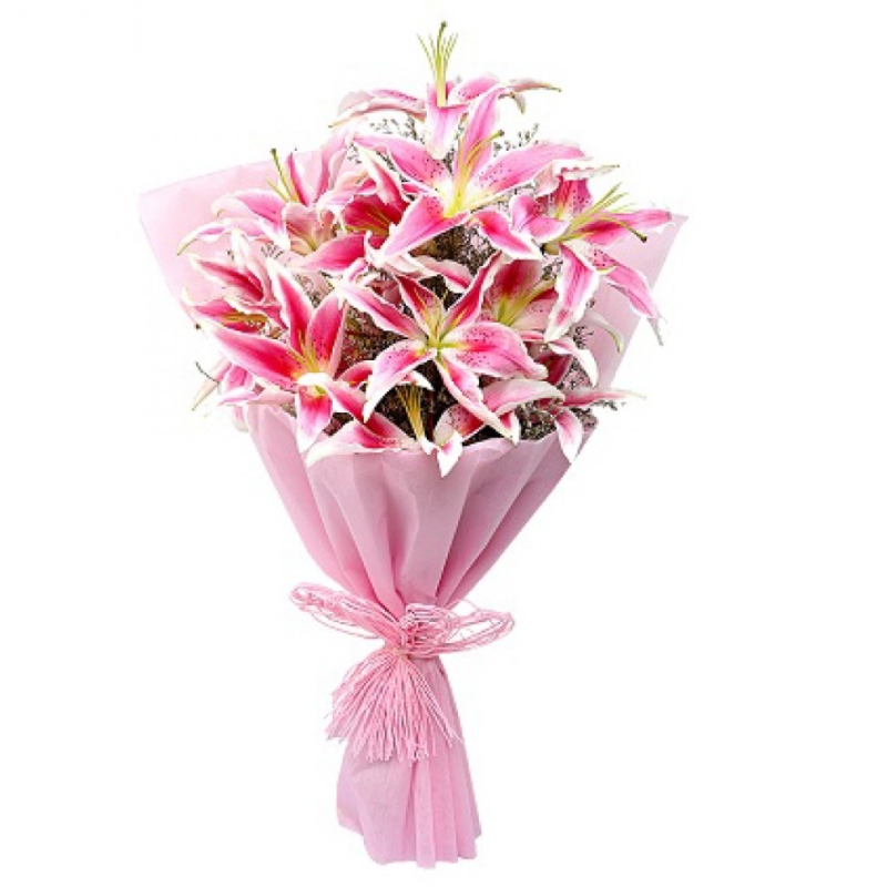 Букет состоит из 5 розовых лилий, красивая упаковка, атласная лента.