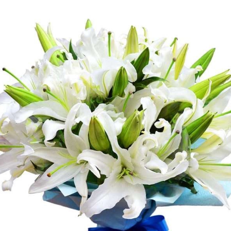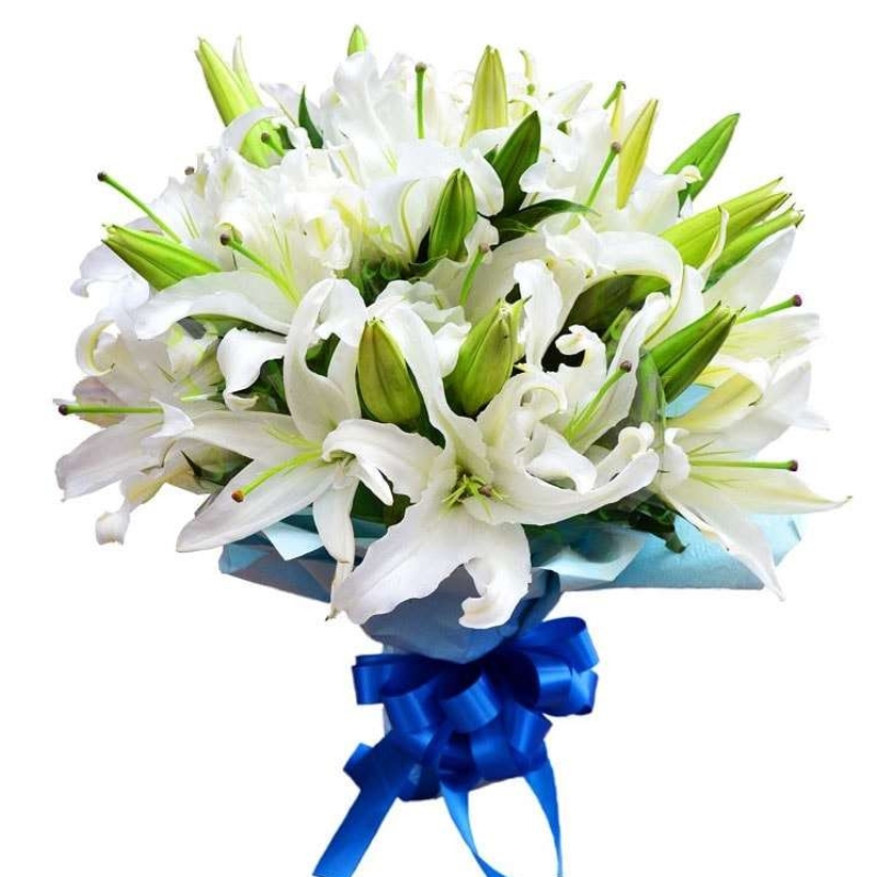 Букет состоит из 13 веток белых лилий, красивая упаковка, атласная лента.