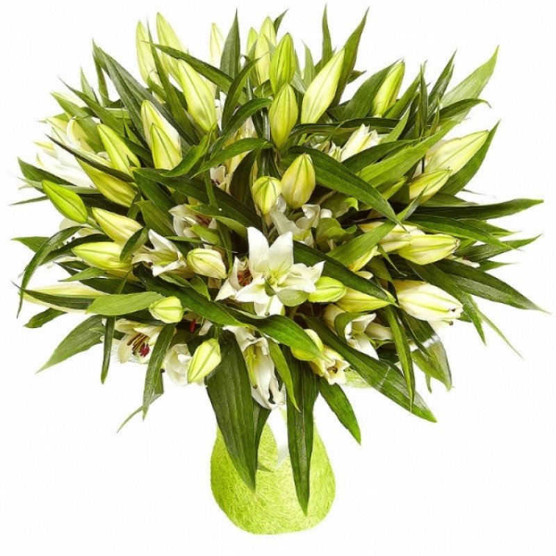 Букет состоит из 21 белая лилия, красивая упаковка, атласная лента.