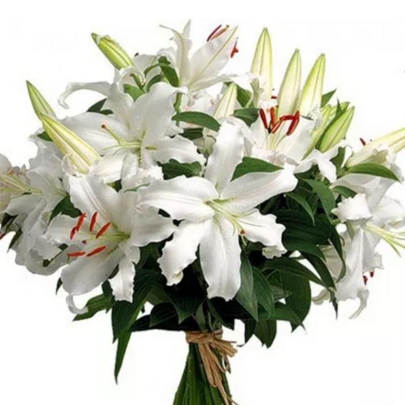Букет состоит из 7 белых лилий, прозрачная упаковка, атласная лента.