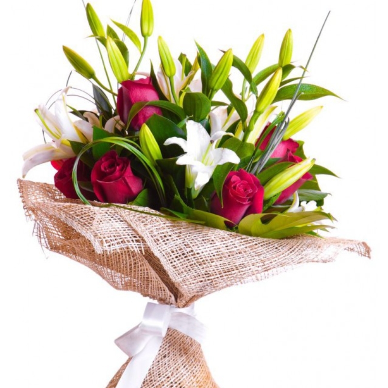 Букет состоит из 7 красных роз, 3 белых лилии, зелень, сетка, атласная лента.