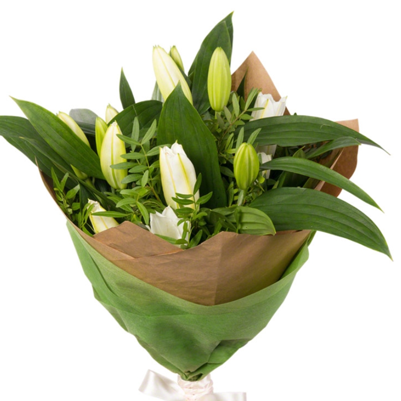 Букет состоит из 3 белые лилии, зелень, крафт, атласная лента.