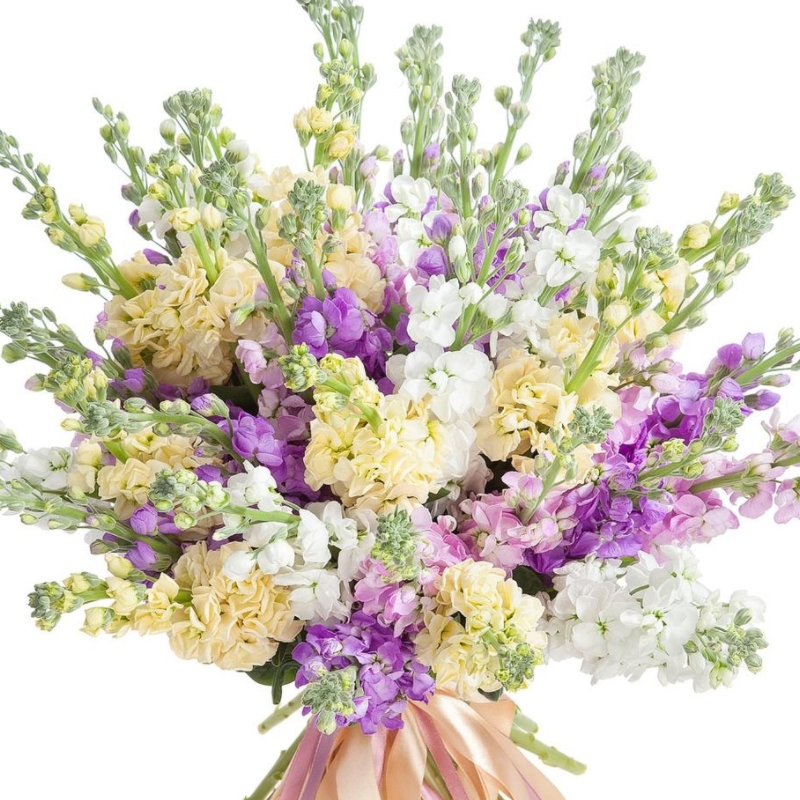Букет состоит из MIX из 19 маттиол, прозрачная упаковка, атласная лента.