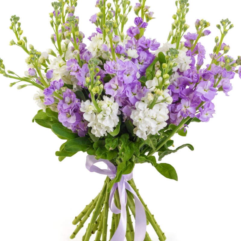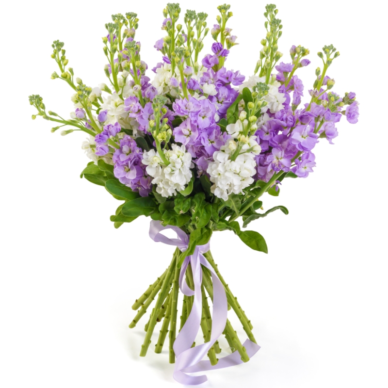 Букет состоит из MIX из 15 маттиол, прозрачная упаковка, атласная лента.