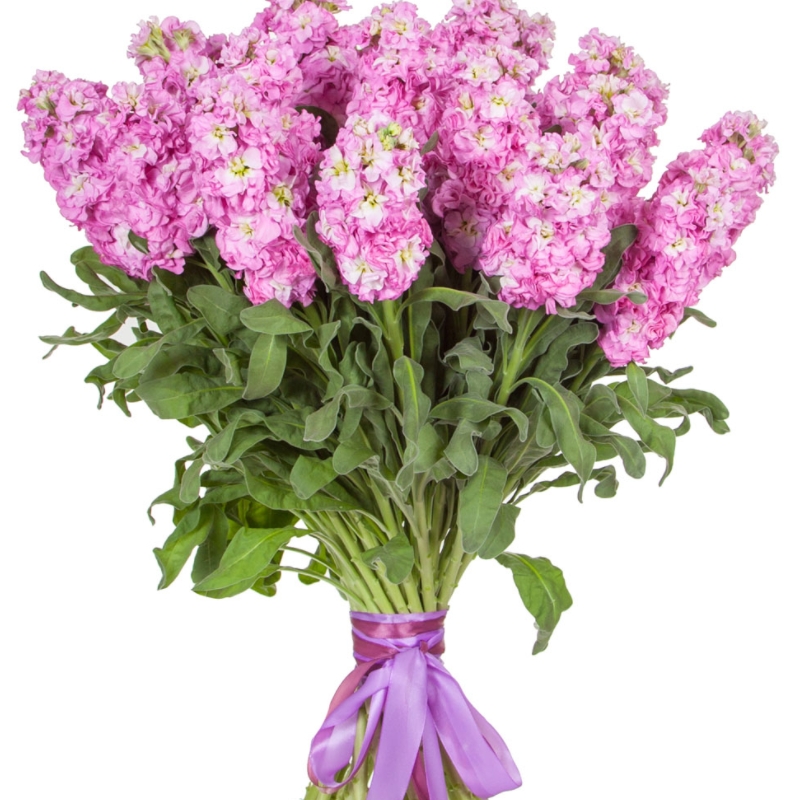 Букет состоит из 21 розовая маттиола, прозрачная упаковка, атласная лента.