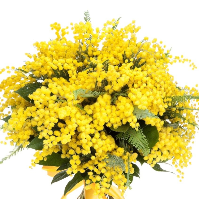 Букет состоит из 21 мимоза, прозрачная упаковка, атласная лента.