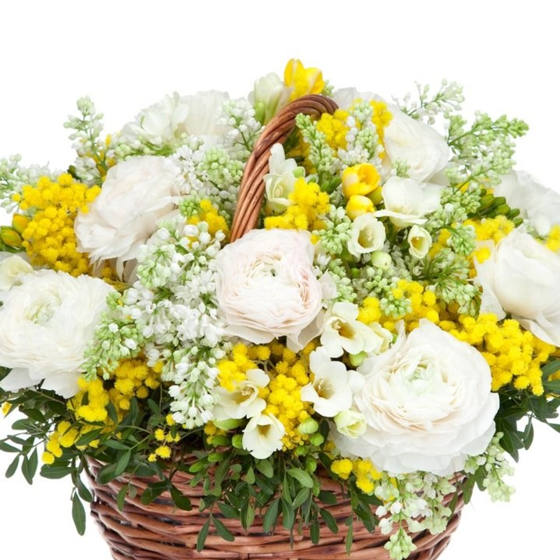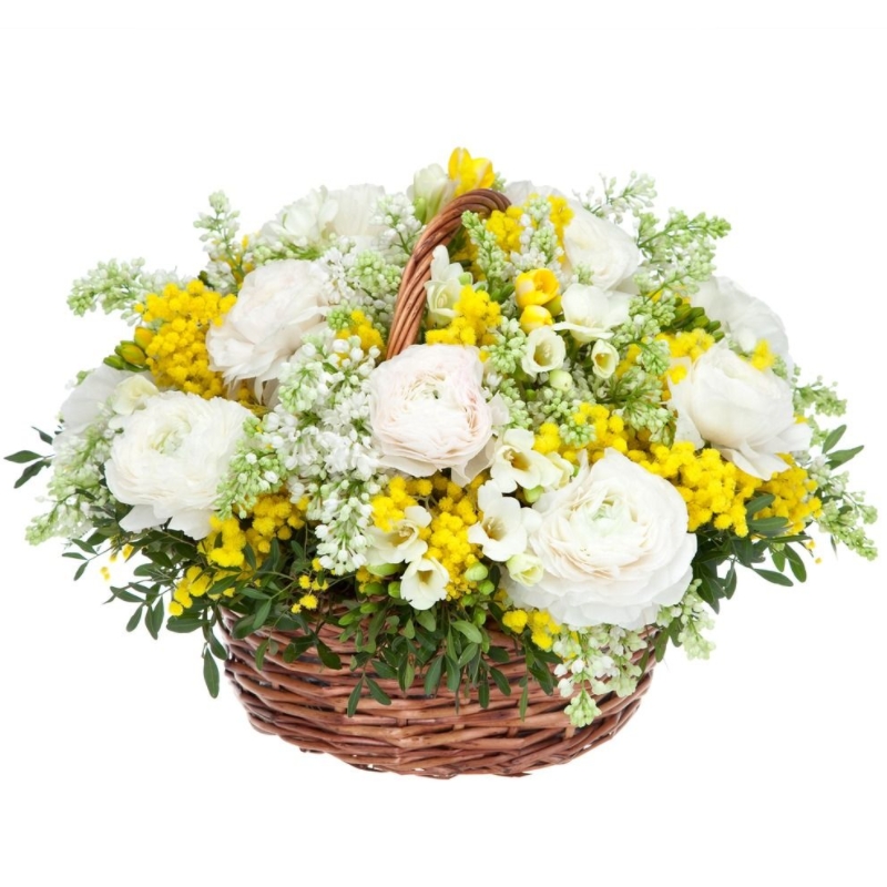 Букет состоит из 11 ранункулюсов, 10 веток сирени, 10 веток эустомы, зелень, корзина, оазис.
