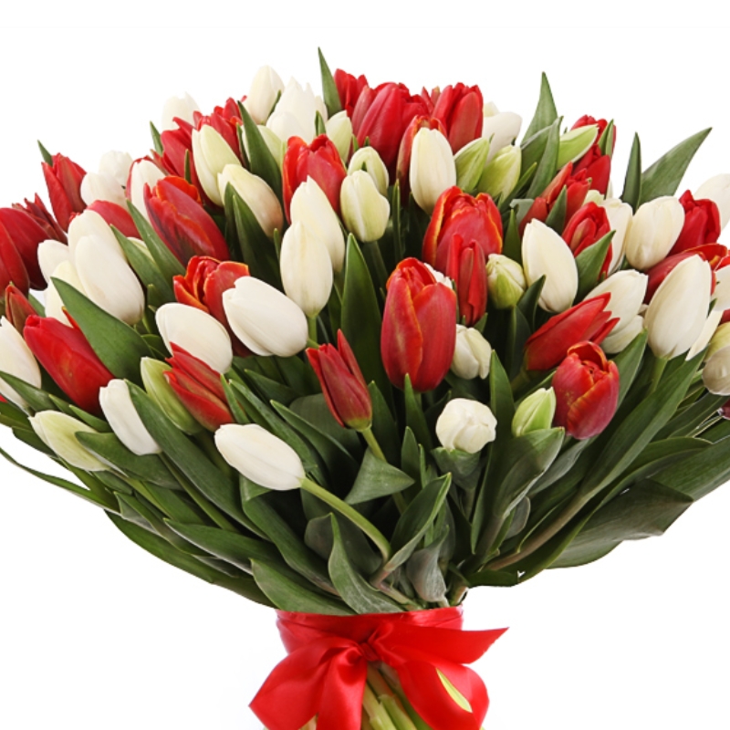 Букет состоит из 51 красный тюльпан, 50 белых тюльпанов, красная лента.