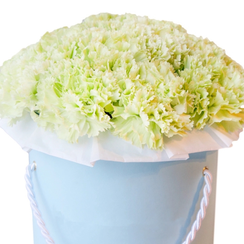 Букет состоит из 25 зеленых гвоздик, коробка, оазис.
