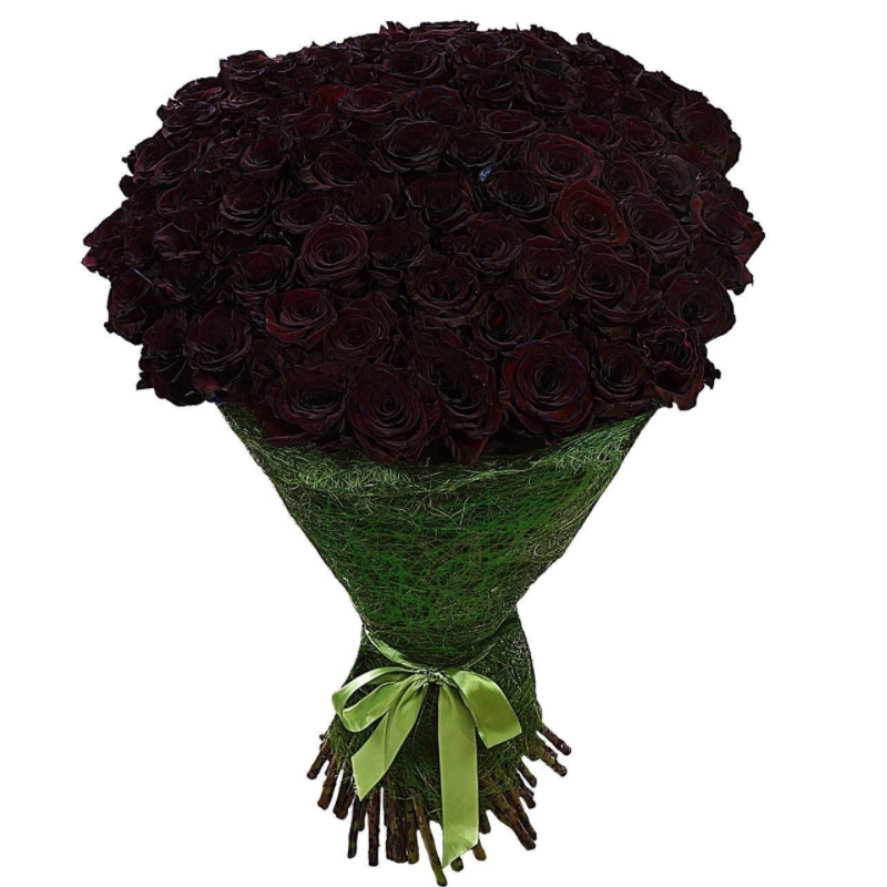 Букет состоит из 100 темно-бордовых роз, сизаль, лента.