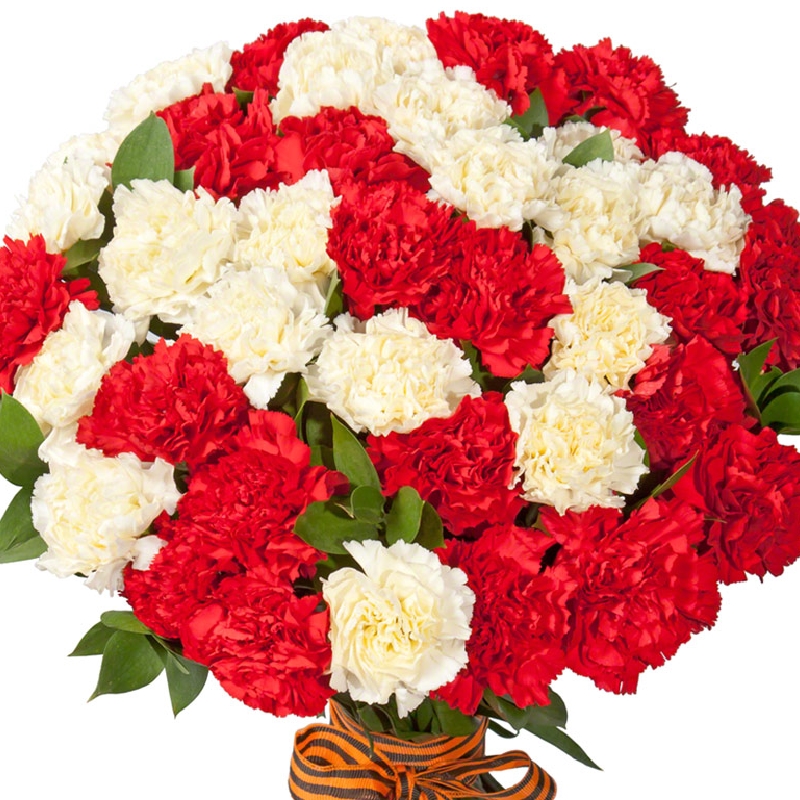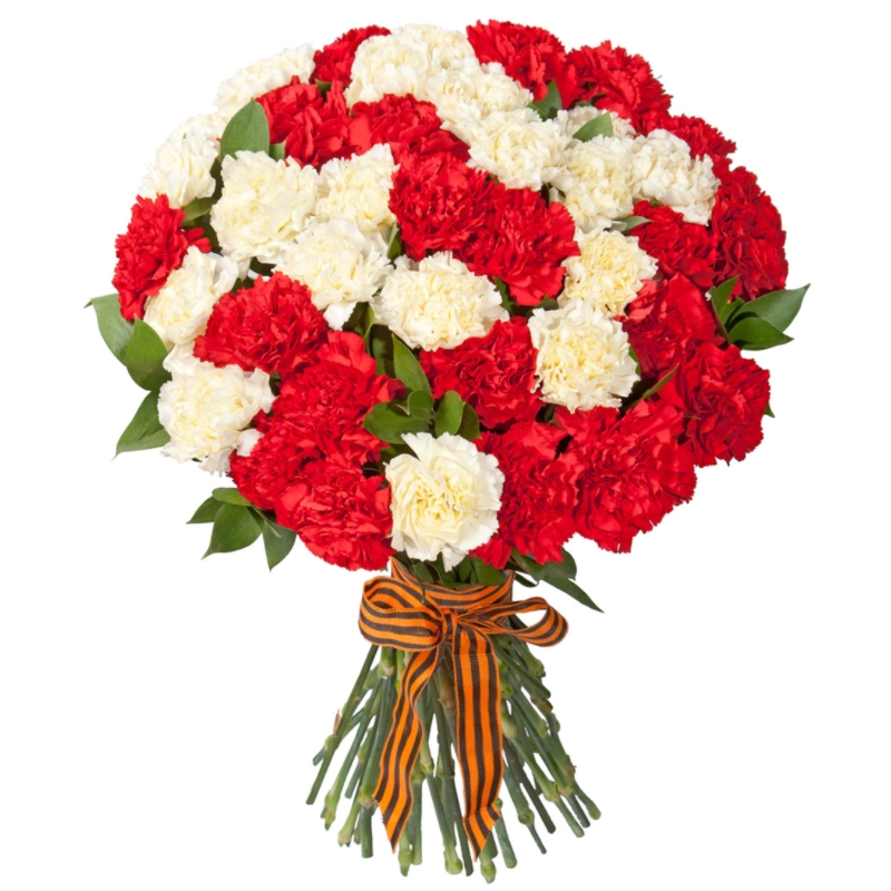 Букет состоит из 25 белых гвоздик, 25 красных гвоздик, прозрачная упаковка, лента.
