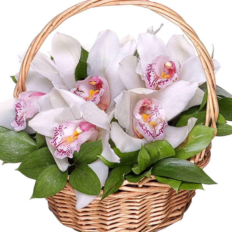 Букет состоит из 7 орхидей, зелень, корзина, оазис.