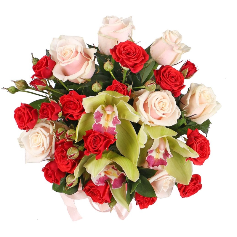 Букет состоит из 7 кремовых роз, 3 ветки кустовых роз, 3 орхидеи, коробка, оазис, атласная лента.