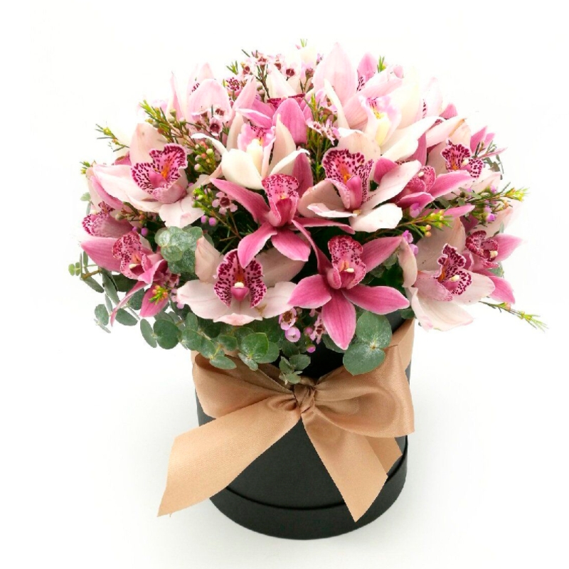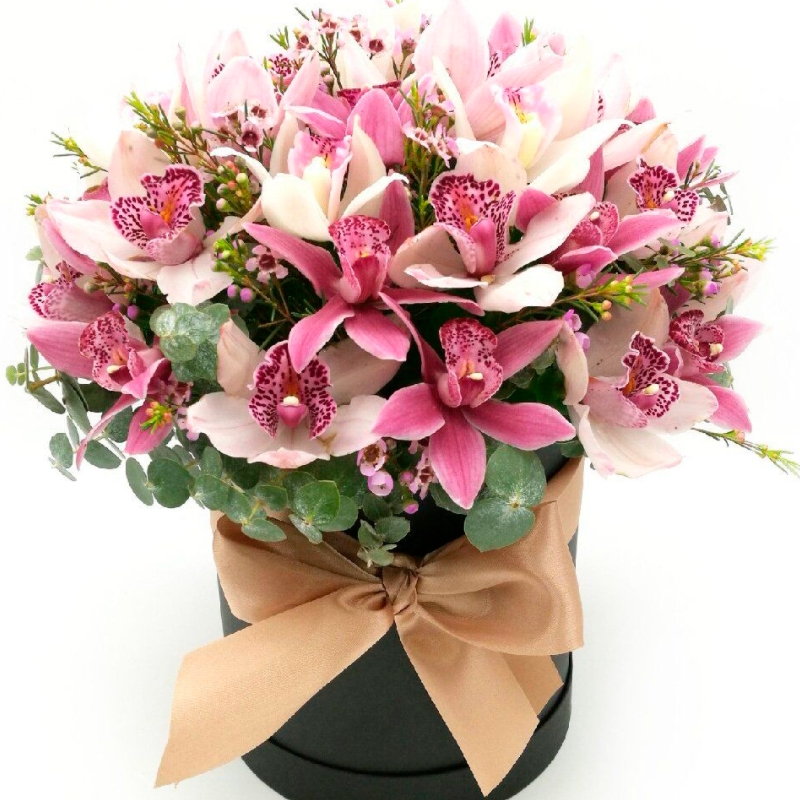 Букет состоит из 31 орхидея, 3 ветки хамелациума, зелень, коробка, оазис, атласная лента.
