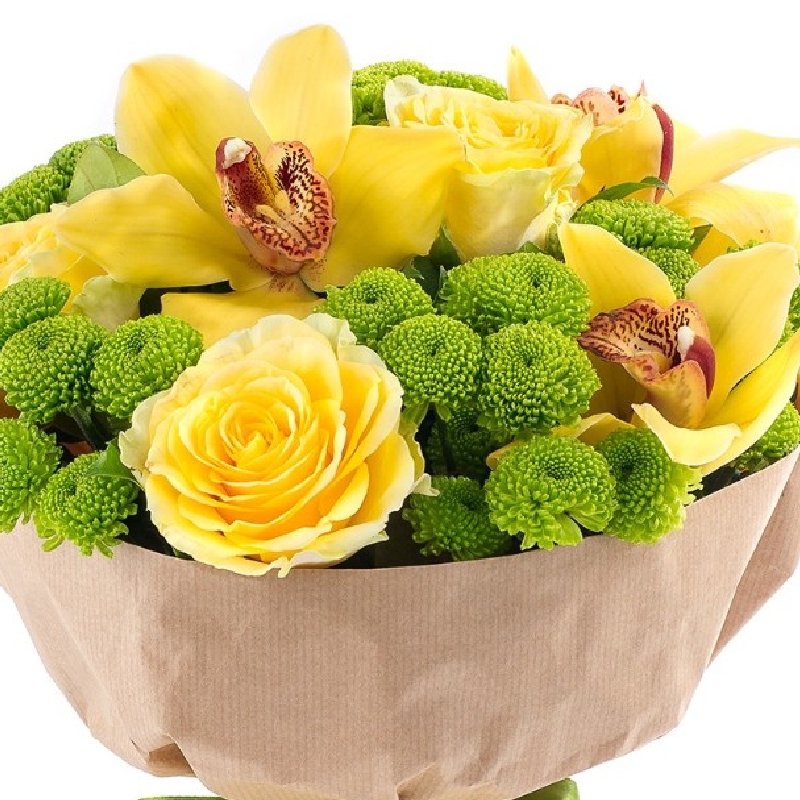 Букет состоит из 4 желтые розы, 3 орхидеи, 6 хризантем Сантини, крафт, атласная лента.