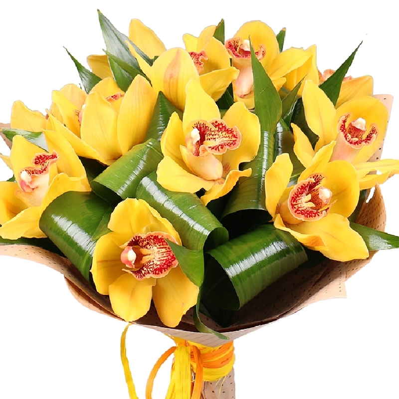 Букет состоит из 11 желтых орхидей, аспидистра, крафт, атласная лента.