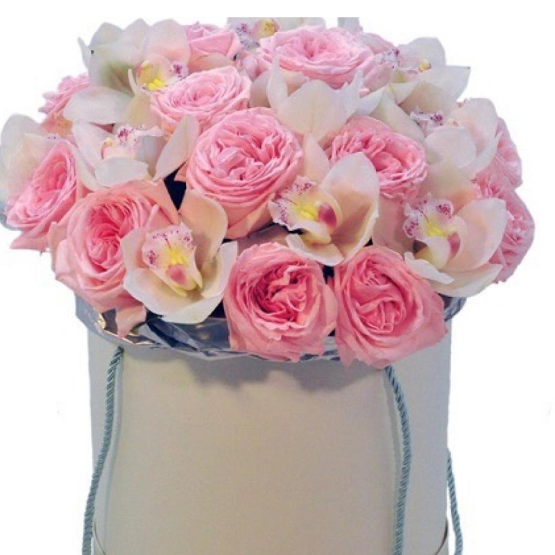 Букет состоит из 21 розовая пионовидная роза, 10 орхидей, коробка, оазис.