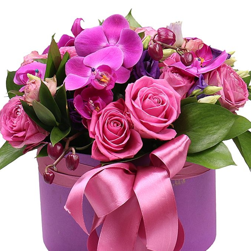 Букет состоит из 11 роз, 5 орхидей, 3 ветки эустомы, 3 гиперикум, зелень, коробка, оазис, атласная лента.