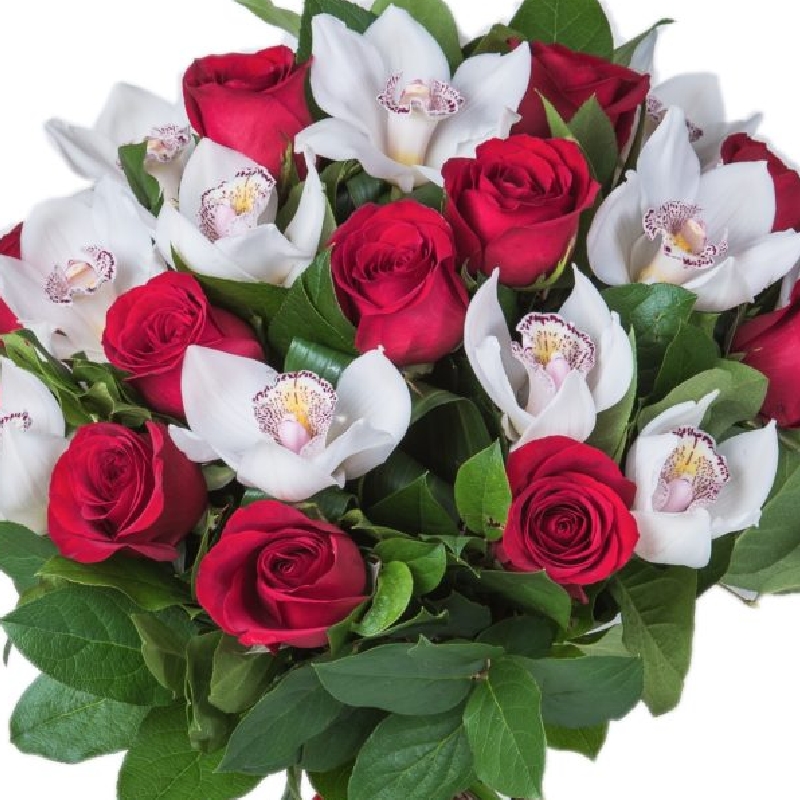 Букет состоит из 13 красных роз, 12 белых орхидей, салал, прозрачная упаковка, атласная лента.