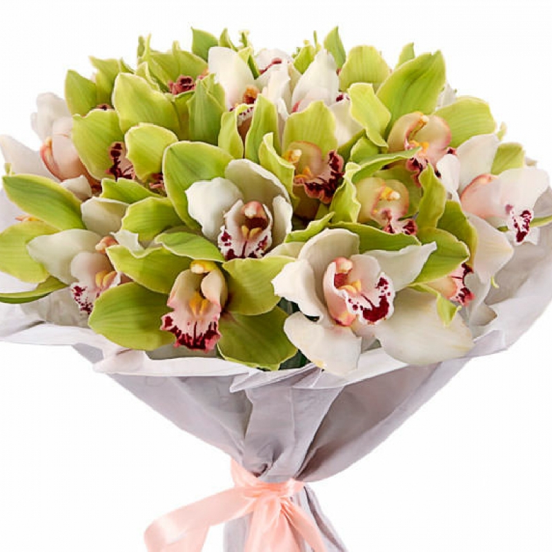 Букет состоит из 25 орхидей, красивая упаковка, атласная лента.