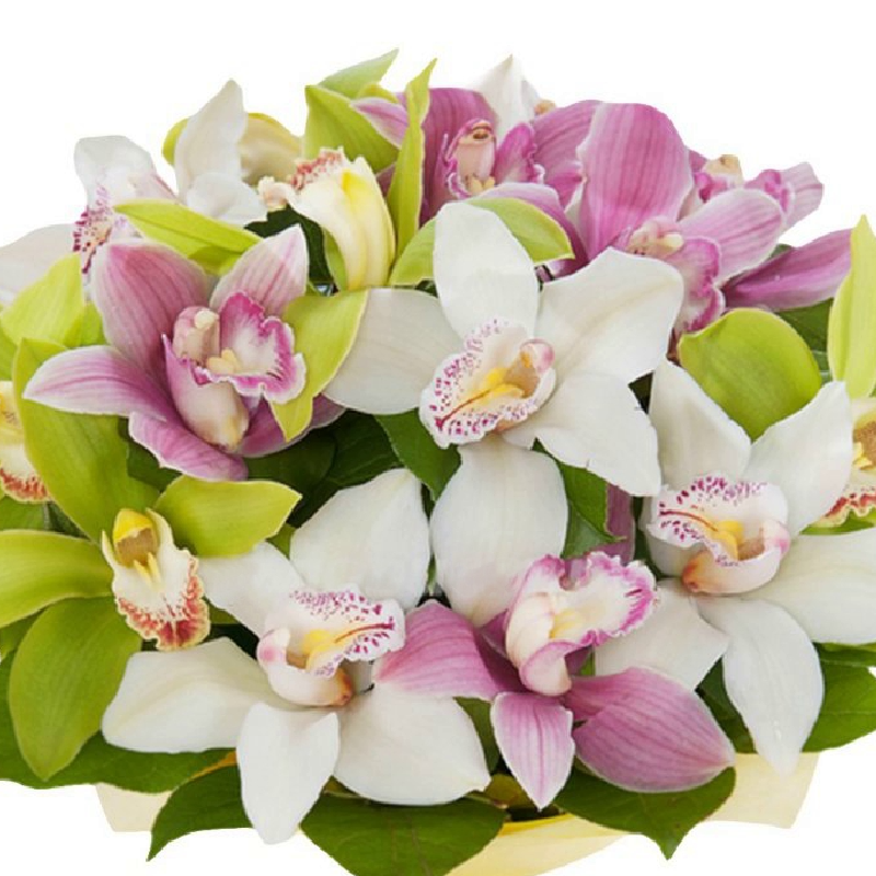 Букет состоит из MIX из 15 орхидей, прозрачная упаковка, атласная лента.