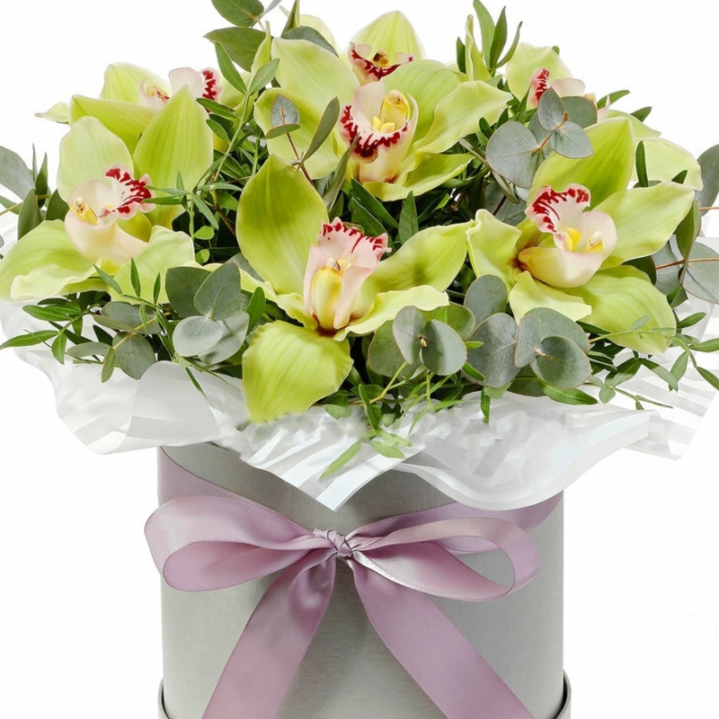 Букет состоит из 11 орхидей, зелень, коробка, оазис, атласная лента.
